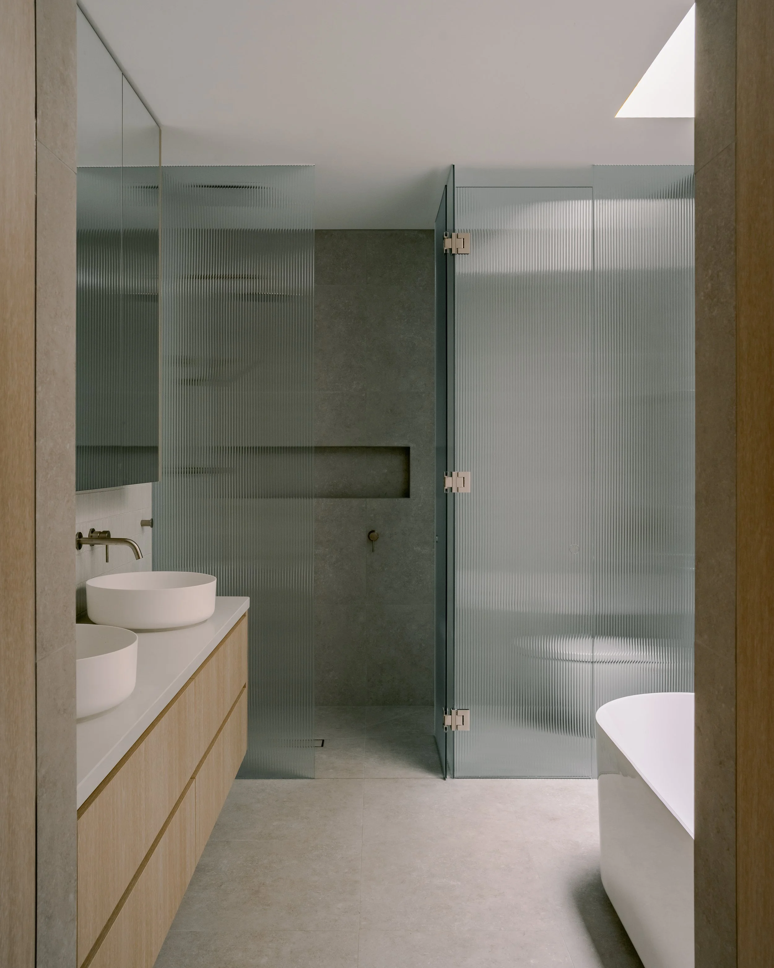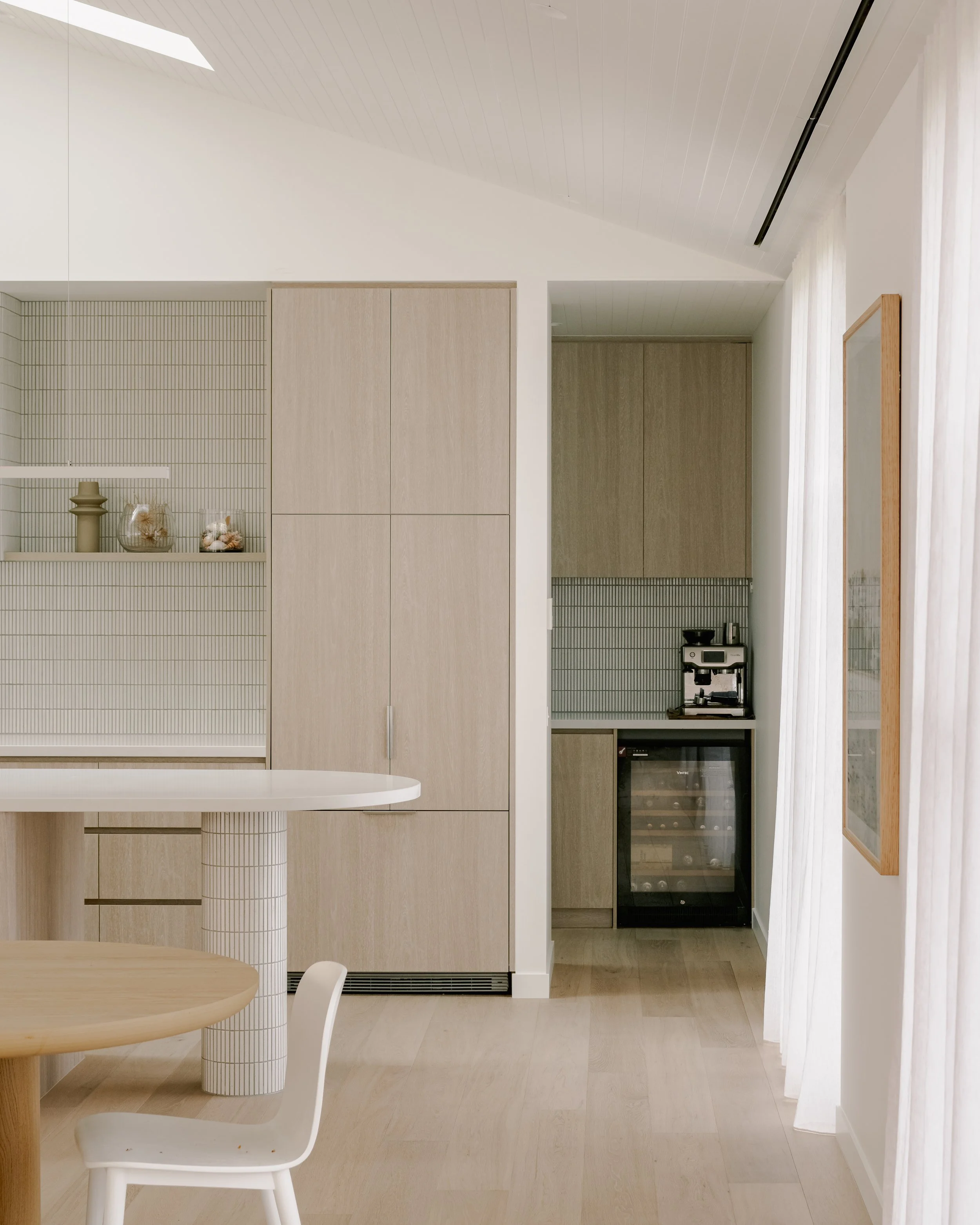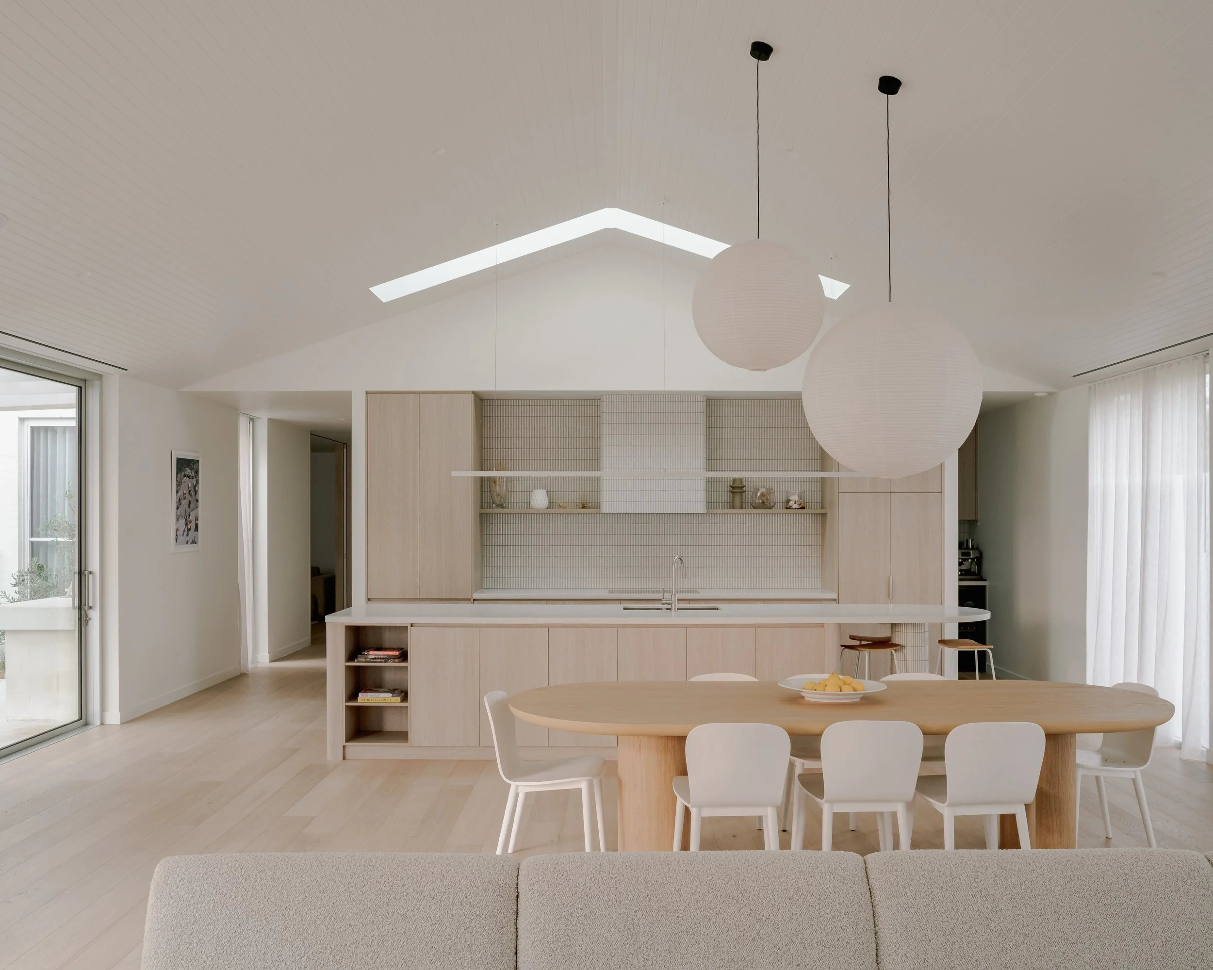Nestled in the picturesque landscape of Sorrento on the Mornington Peninsula, this house harmoniously integrates with its surroundings through a muted palette of bagged brick, timber, stone, and concrete. The design maximizes the footprint to offer ample amenities for a large family, while cleverly incorporating features that cater to downsizers seeking simplicity without sacrificing style. Expansive indoor and outdoor living spaces flow effortlessly, with a large kitchen, dining, and living area seamlessly opening to a serene lawn, a BBQ alfresco, and a refreshing pool, creating an inviting environment for gatherings and relaxation alike.